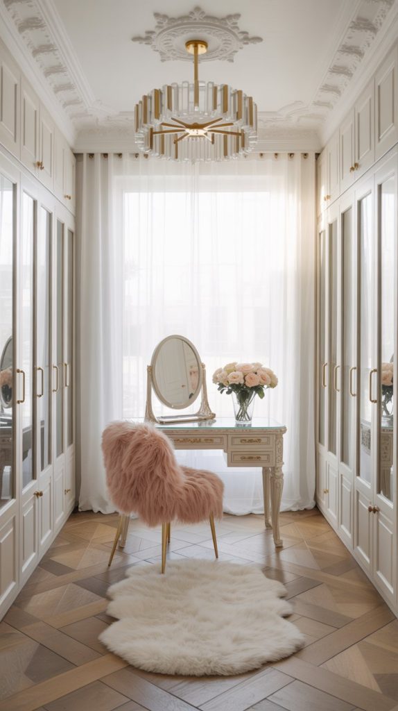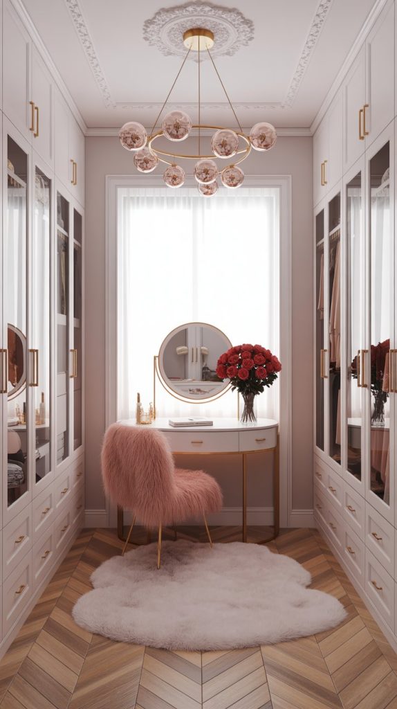 A central desk with a round mirror and soft pink roses makes this closet double as a personal beauty station — perfect for hair, makeup, or trying on accessories.